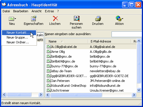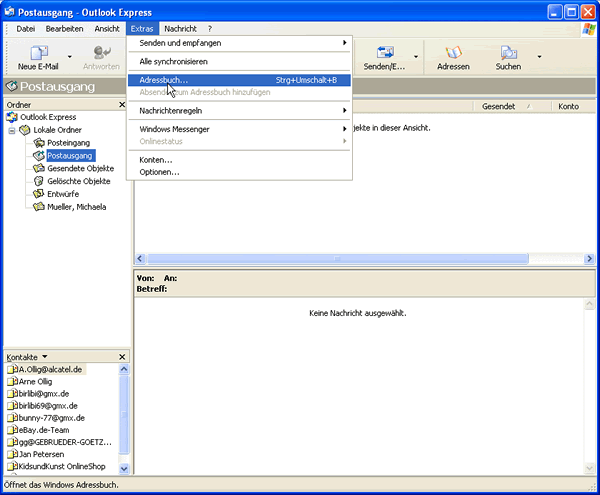 Outlook Express bietet die Funktion eines Adressbuches, damit man sich nicht alle eMail Adressen merken muss. Die Verwaltung des Adressbuches erreicht man am Besten wenn man in Outlook Express im Menü "Extras" auf "Adressbuch..." geht.
