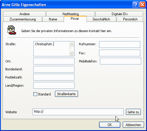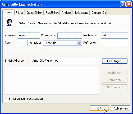 Im folgenden Fenster können Sie alle vorhandenen Daten eingeben. Die wichtigsten sind Vorname, Name und natürlich die eMail Adresse. Wie eMail Adressen aussehen, kann man hier nachlesen.Danach noch auf <OK> und der Eintrag ist gespeichert.