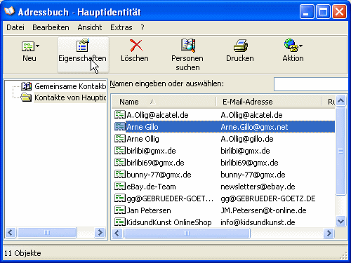 Um eine vorhanden Adresse zu bearbeiten markiert man diese und klickt auf <Eigenschaften".