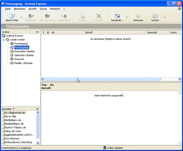 Die Ansicht von Outlook Express kann je nach Einstellung variieren. Der Bildschirm teilt sich in mehrere Bereiche. Im linken Bereich sollten alle vorhandenen Ordner zu sehen sein. Im rechten oberen Teil ist der Inhalt, sprich die im Ordner vorhanden eMails, des im linken Teil markierten Ordners zu sehen. Im rechten unteren Teil eine Vorschau auf die im oberen rechten Teil markierten eMail.