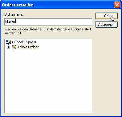 Nun gibt man dem neuen Ordner einen individuellen Namen. Will man z.B. alle eMails von und an Marlies in einen eigenen Ordner ablegen, würden wir ihn auch so nennen: Marlies. Im unteren Teil können wir noch sehen, worunter der Ordner angelegt wird. Wollen wir dies ändern klicken wir auf das kleine Plus und sehen die komplette Ordnerstruktur. Dort wählen wir dann einfach mit der linken Maustaste den gewünschten übergeordneten Ordner aus. Nun noch auf <OK> klicken.