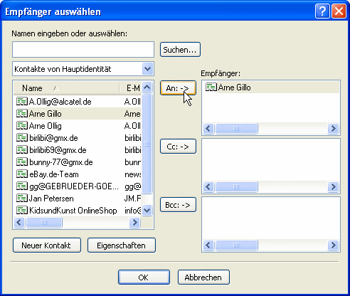 Nun wählt man im linken Bereich des Adressbuches den gewünschten Empfänger und klickt auf <An:>. Der gewählte Empfänger erscheint nun auch im rechten Teil des Adressbuches. Will man noch mehrere Empfänger auswählen, wiederholt man den Vorgang solange, bis alle Empfänger im rechten Teil des Adressbuches zu sehen sind. Will man dagegen cc- oder bcc-Empfänger hinzufügen klickt man halt anstatt auf <An> auf das entsprehende Feld <Cc:> bzw. <Bcc>. Was cc- bccc-Empfänger bedeudet, kann man hier nachlesen. Danach einfach auf <OK> klicken.