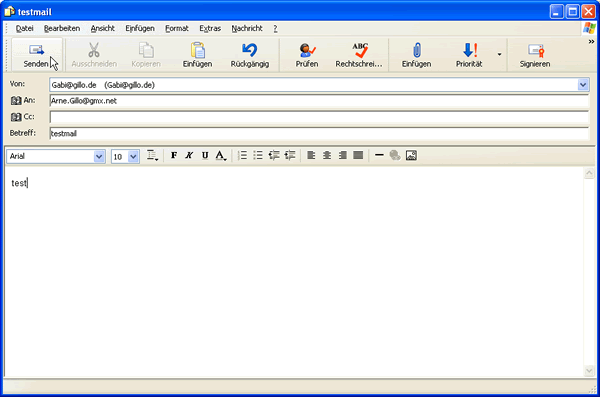 Die standard Absenderadresse ist schon bei "Von" eingetragen. Nun klickt man auf <An> wenn man die Adresse im Adressbuch gespeichert hat oder gibt die genaue bekannte eMail Adresse direkt in das Feld ein. Wie eMail Adressen aussehen, kann man hier nachlesen.